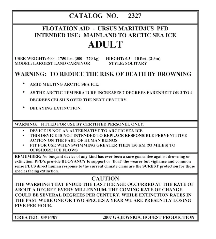 This work is intended to be simultaneously serious, playful, and absurd. While polar bears are strong swimmers, they will face great challenges amid an increasingly warming arctic ecosystem. While we can avert disaster and equip ourselves with various tools and technologies to mitigate climatic shifts, other animals, such as polar bears, may not be so fortunate. How might we intervene in increasingly changing environments?